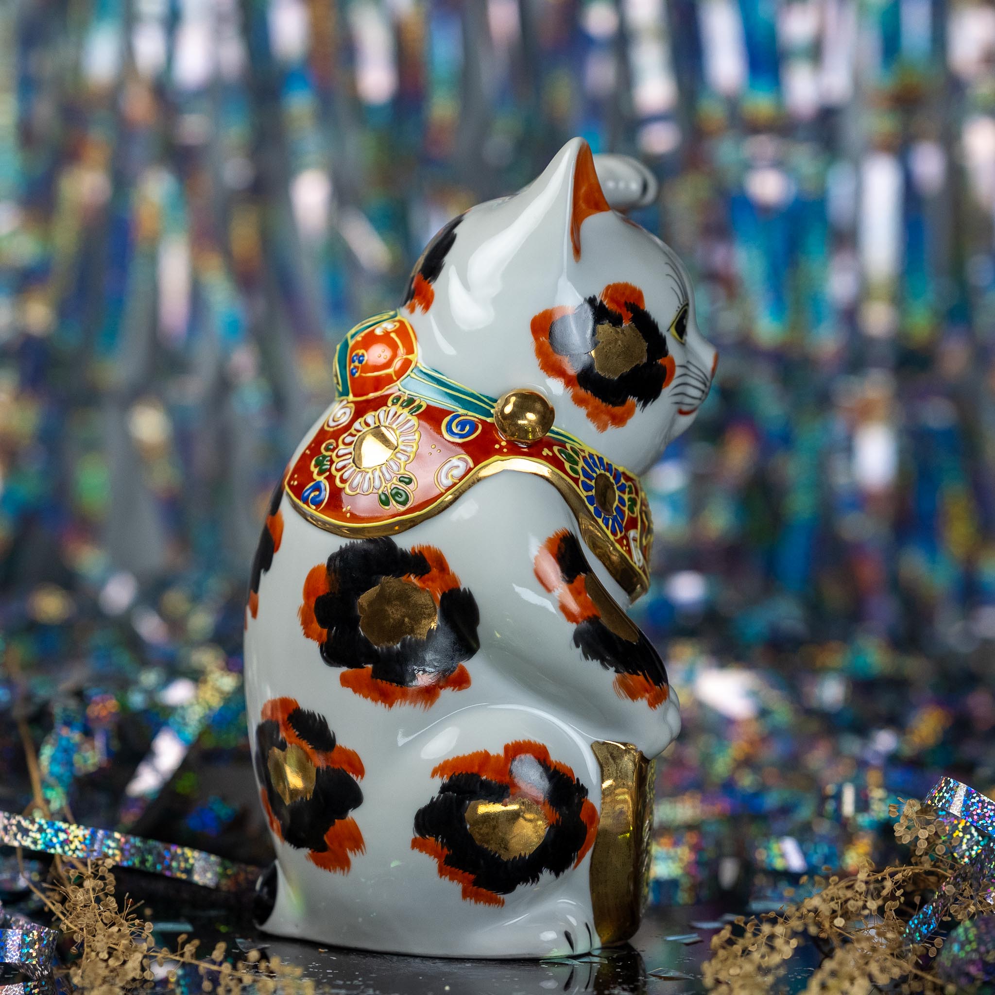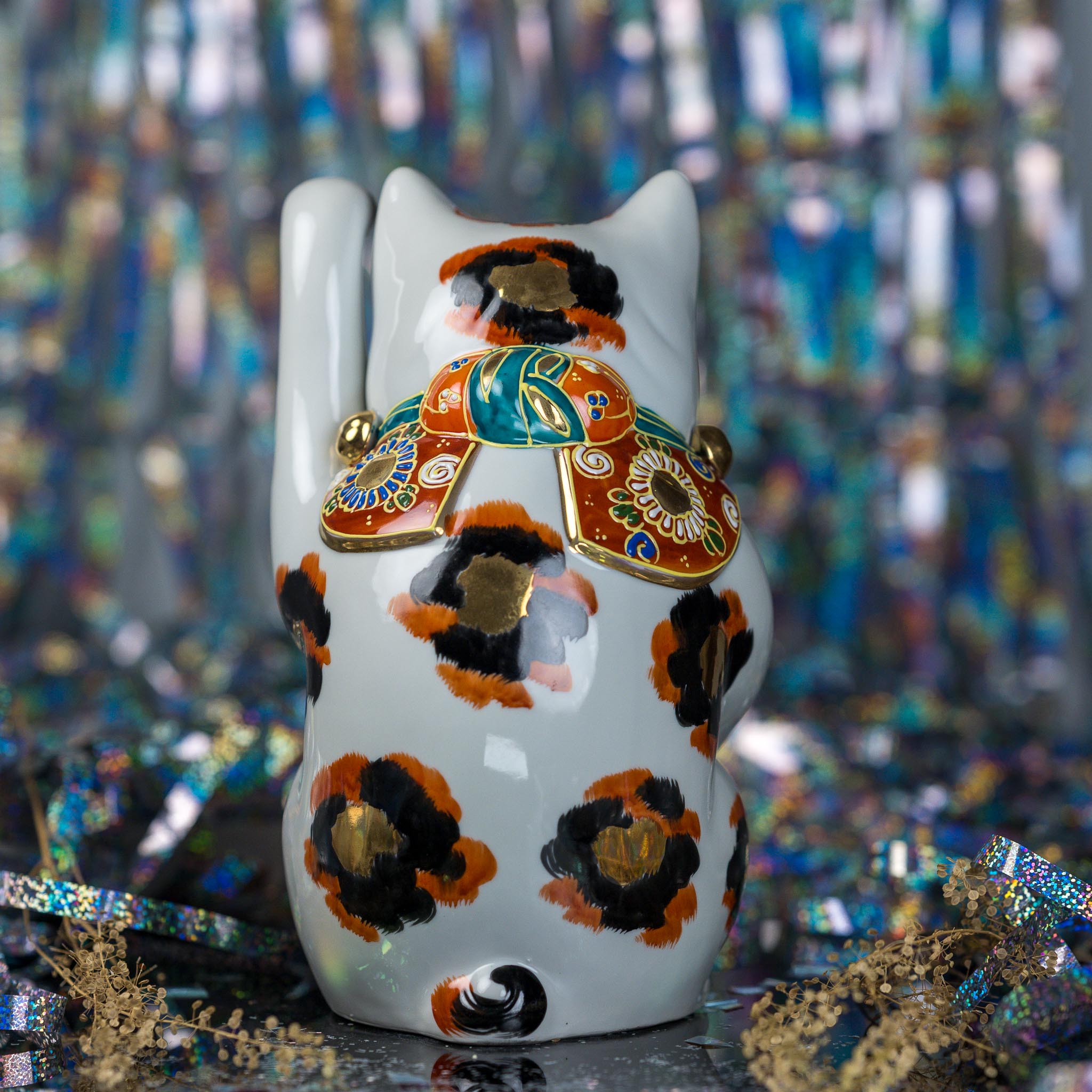 三毛貓常是黑色、白色和橙色的毛色組合,但九谷燒的三毛貓並不甘於此,更配有奢華鮮明的金色,明亮的色彩使其在眾多貓咪造形中脫穎而出,被視為是帶來好運和繁榮的象徵。